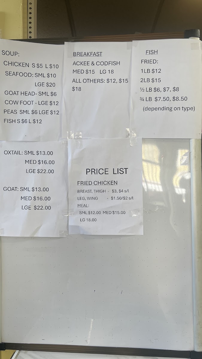 The Lunch and Dinner offerings are the soul of the menu, dishing out slow-cooked, savory classics with Caribbean flair. The Oxtails with Sides are a favorite, rich and tender, while the Curried Goat and Peppered Steak (available Tuesdays and Fridays) bring depth and heat. Weekly specials like Curried Chicken on Tuesdays and Thursdays and Brown Stew Chicken round out a hearty menu that speaks to homestyle cooking and bold seasoning.