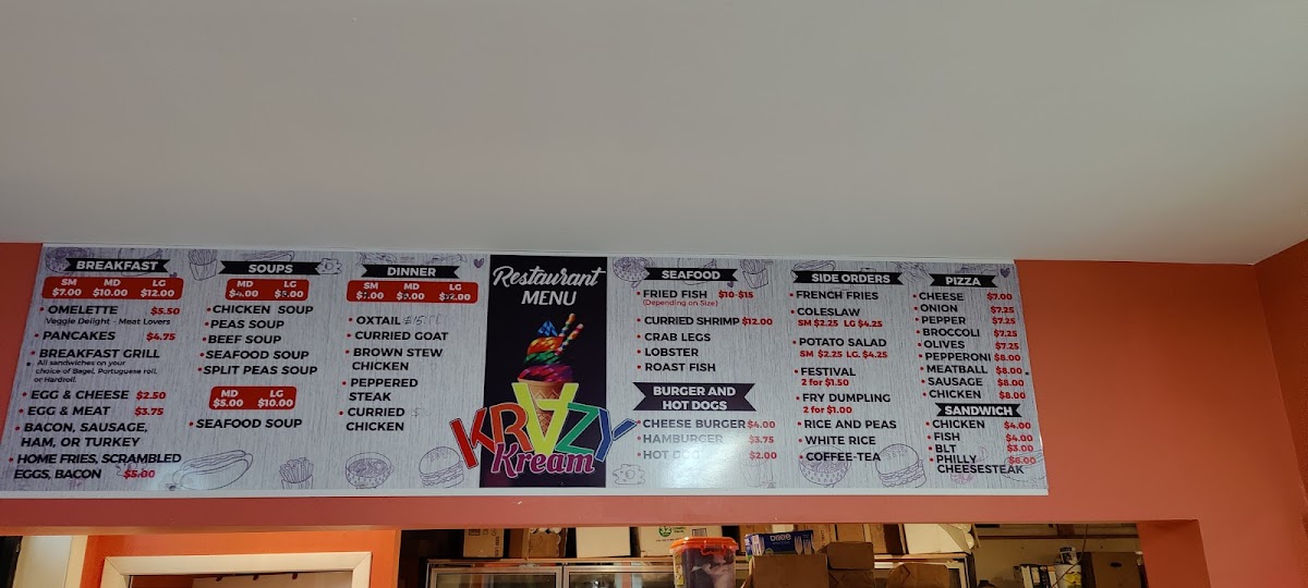 Lastly, the rotating Soups of the Day offer warm comfort and variety: Chicken Soup is available Monday through Thursday, Beef Soup on Wednesdays, Vegetarian Soup on Thursdays, and a hearty Seafood Soup on Saturdays. The Krazy Kream Menu truly captures a culinary journey that’s flavorful, diverse, and grounded in both tradition and community, making it a Bridgeport gem worth savoring.