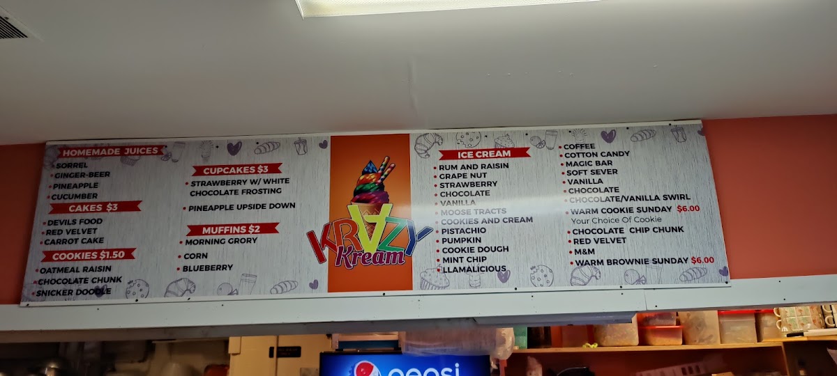 For dessert-or a mid-day indulgence-the Ice Cream section adds a “krazy” fun twist with flavors like Rum & Raisin, Grapenut, Banana Boat, Sour Sop, and Stout, offering a delightful nod to Caribbean dessert culture.